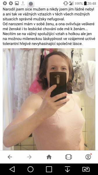 Kdo jsem:Jsem transexuálka i lesbička s úplným ženským myšlením i s vnímáním žen jako nejlepších přátelkyň i partnerek, jsem zaměřená srdcem i sexuálně jen na ženy.