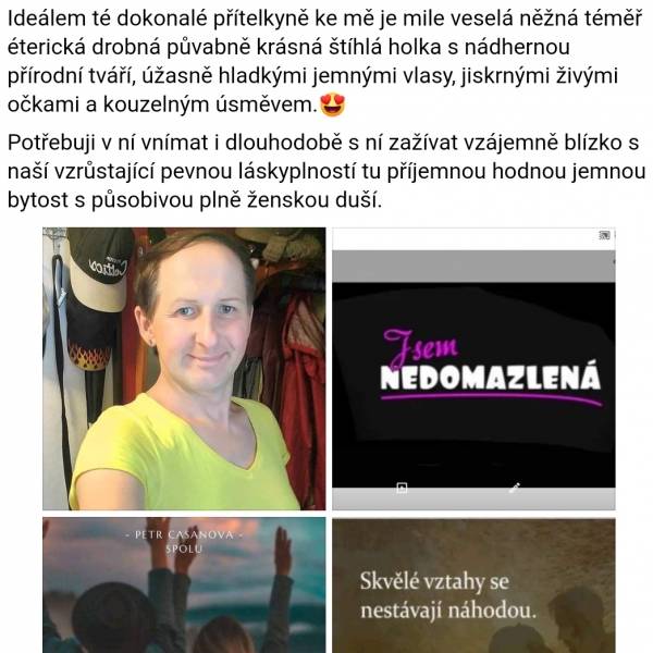 Po čem toužím:Najití lepšího i šťastnějšího využití svého možného volného času a přeji si probouzet se vedle hodné, milé, tolerantní, způsobilé ženy s roztomilou jemnou tváří a s drobným křivkatým půvabný tělem mladistvě atraktivní dívky nebo ženy bez rodiny nezadanou
